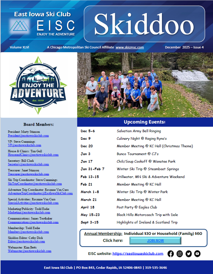 The East Iowa Ski Club is an all-around social club that brings together people who enjoy a variety of activities such as skiing, biking, hiking, kayaking, fishing or simply just touring and traveling. Our goal is to develop and promote exciting, new events in a spirit of camaraderie among current and new friends with common interests. As our logo says, "Enjoy the Adventure".