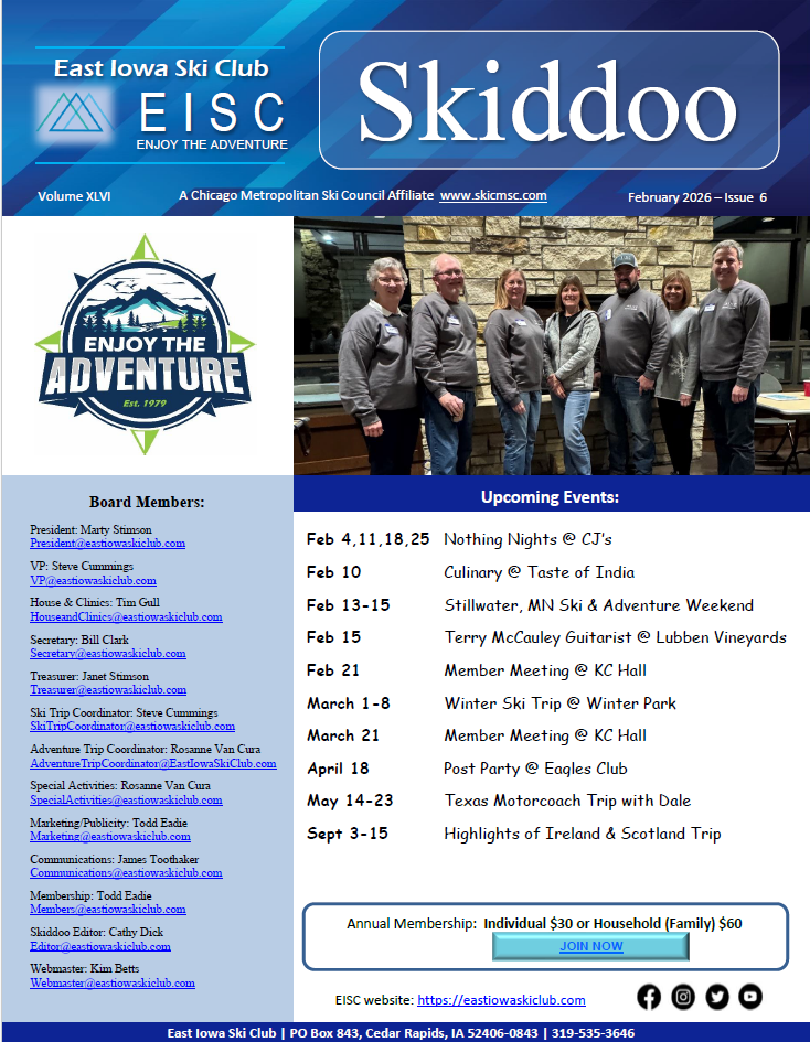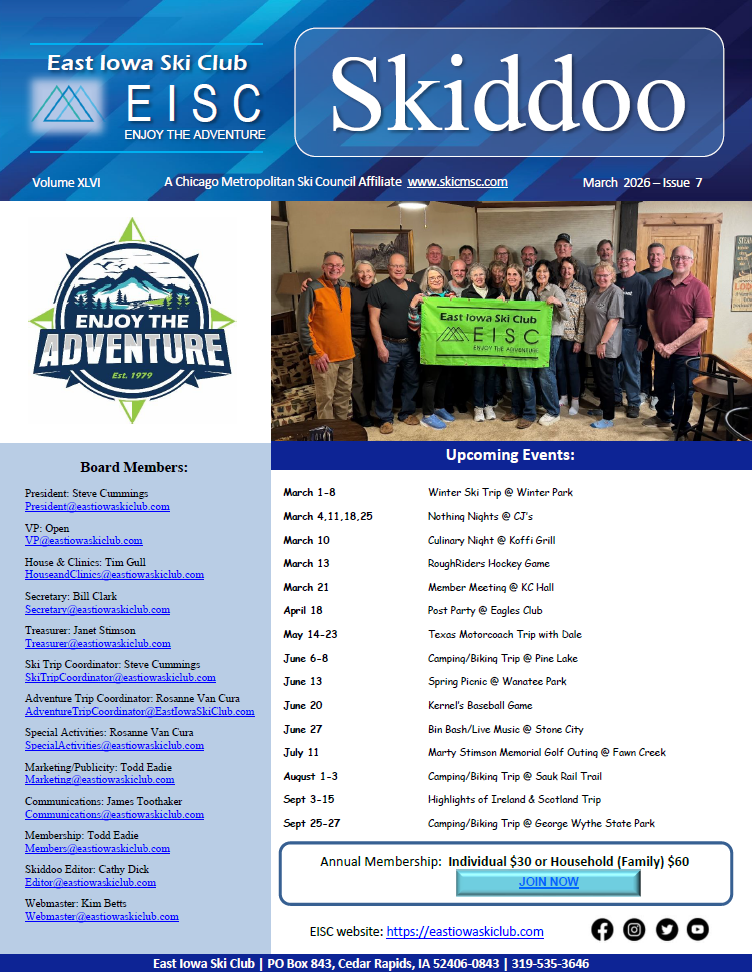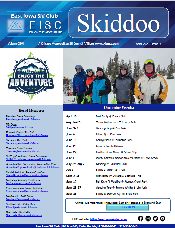 The East Iowa Ski Club is an all-around social club that brings together people who enjoy a variety of activities such as skiing, biking, hiking, kayaking, fishing or simply just touring and traveling. Our goal is to develop and promote exciting, new events in a spirit of camaraderie among current and new friends with common interests. As our logo says, "Enjoy the Adventure".