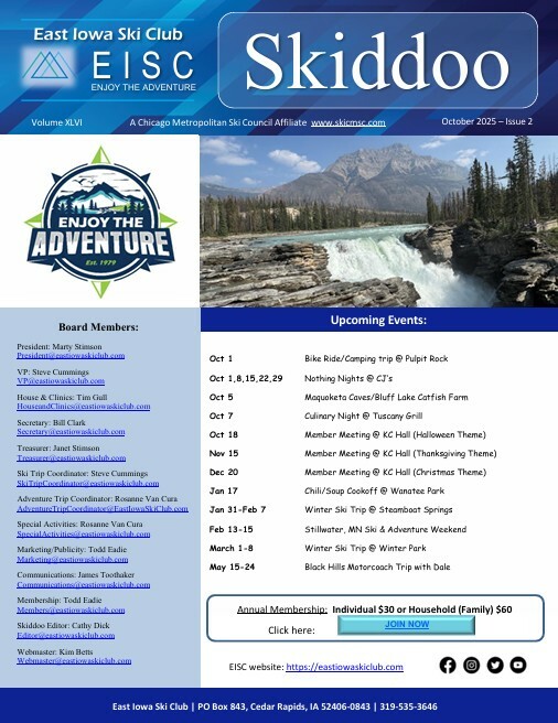 The East Iowa Ski Club is an all-around social club that brings together people who enjoy a variety of activities such as skiing, biking, hiking, kayaking, fishing or simply just touring and traveling. Our goal is to develop and promote exciting, new events in a spirit of camaraderie among current and new friends with common interests. As our logo says, "Enjoy the Adventure".